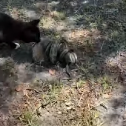 Кошка пытается убежать со змеей, которая ест белку