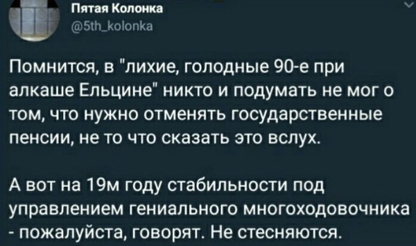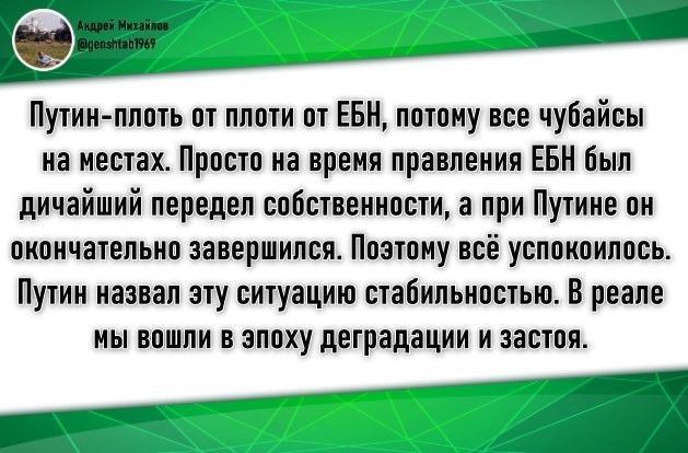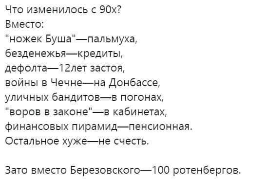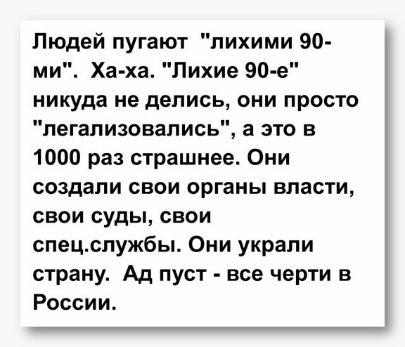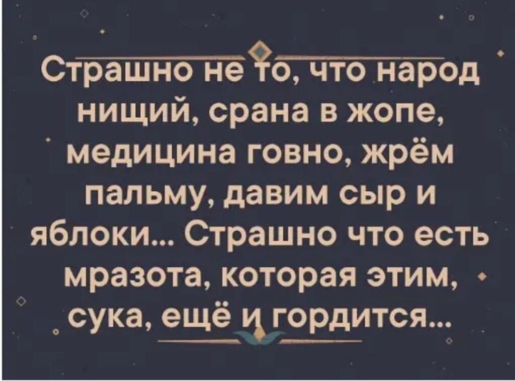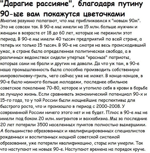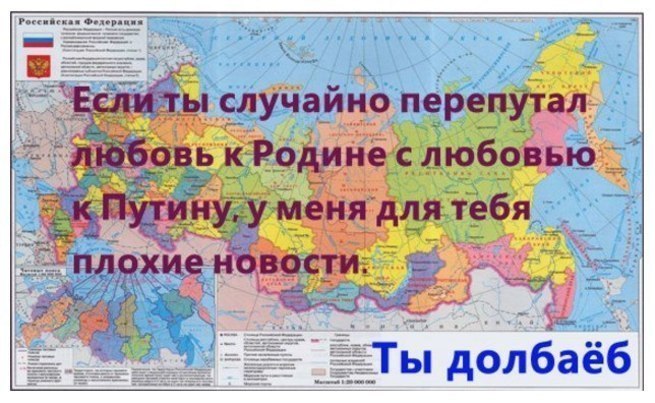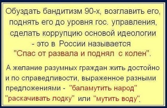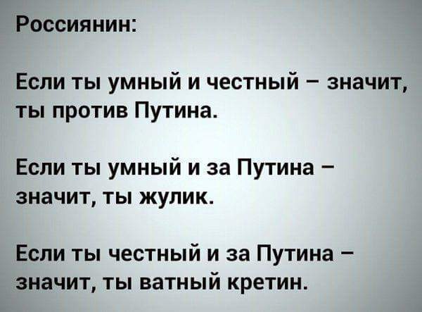 «…Не нравится Россия, езжайте туда, где Вам будет хорошо…» Странное дело: на Украине президент сменился, в Ватикане 3 Папы, а у Пригожина методички всё ещё старые. Вам что, их совсем не обновляют? Требуйте от руководства, иначе совсем глупышами выглядите. В каком месте вы увидели нелюбовь к России? Не выдавайте свои фантазии за истину и не уподобляйтесь ольгинскому отребью (если вы не из них), которое сразу же набегает на защиту своих кормчих, стоит только появиться какому-нибудь факту, компрометирующему режим - они тут как тут! Надо же отрабатывать денежки, выделенные на информационные диверсии. Это только для быдла Родина - синоним слова "режим". И под этим "волшебным словом", доносящимся из уст "её верховных правообладателей" происходят немыслимые для здравомыслия и логики вещи: Массовые убийства, массовые посадки за колючку, в частности за инакомыслие и его свободное выражение. А ещё под этим "лозунгом" отправляют 18-20-ти летнее пушечное мясо на бойню. По какому из 10-ти важнейших для жизни человека показателей Россия входит в список 20-ти сстран? НИ ПО ОДНОМУ!