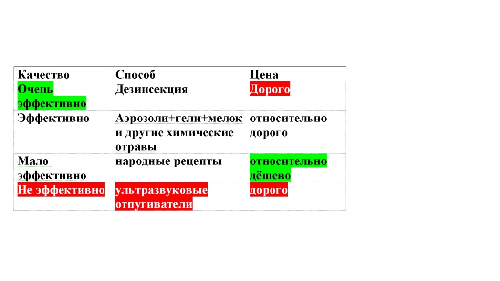 Если мы сравним по эффективности перечисленные виды борьбы с тараканами, то получим следующий результат: