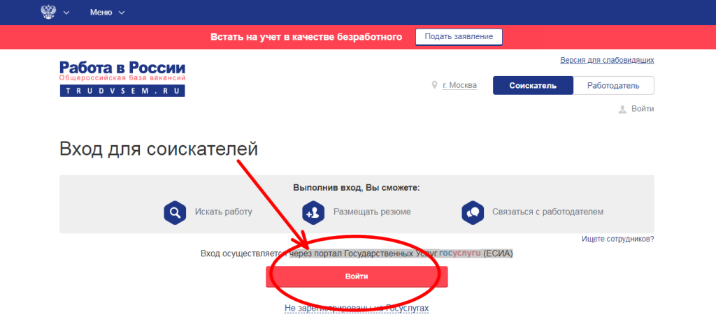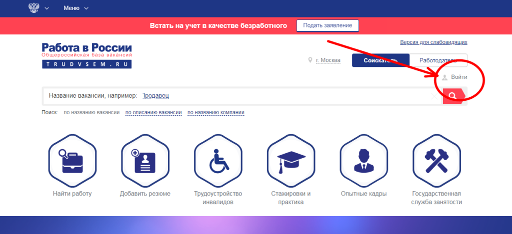 1. Заходим на сайт https://trudvsem.ru/ и нажимаем Войти