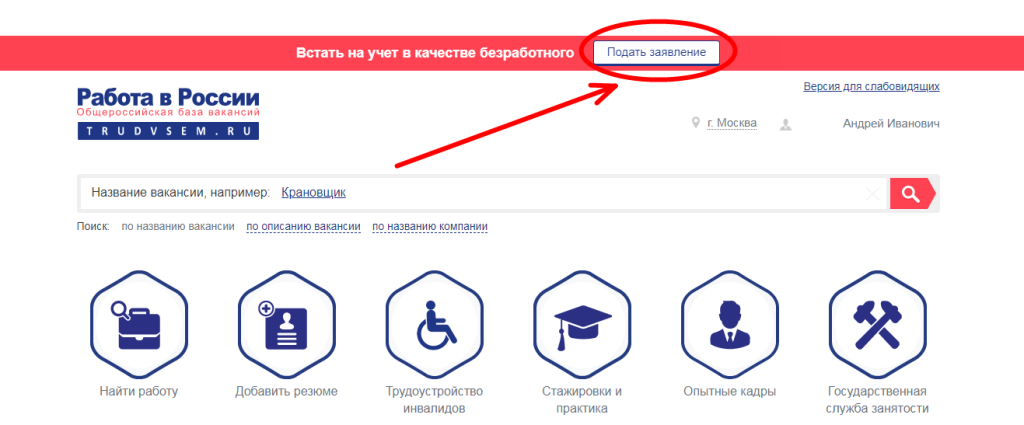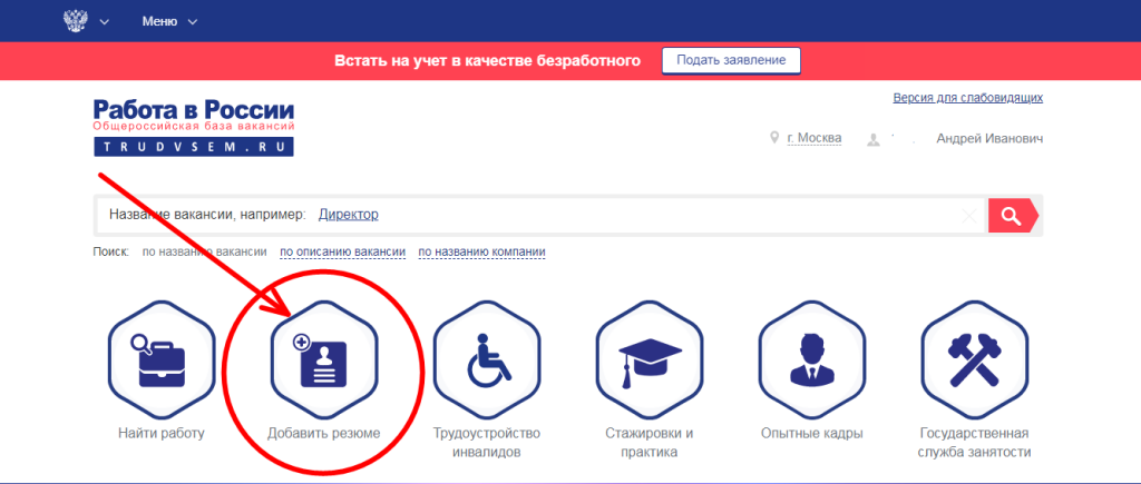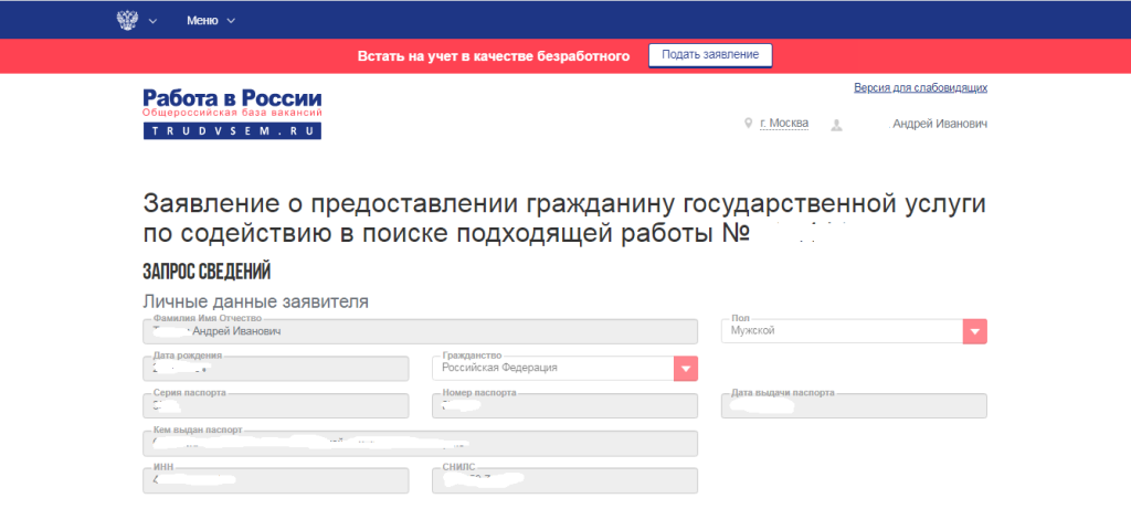 6. После того как заполните и сохраните резюме нажимаем "Встать на учет в качестве безработного" Подать заявление