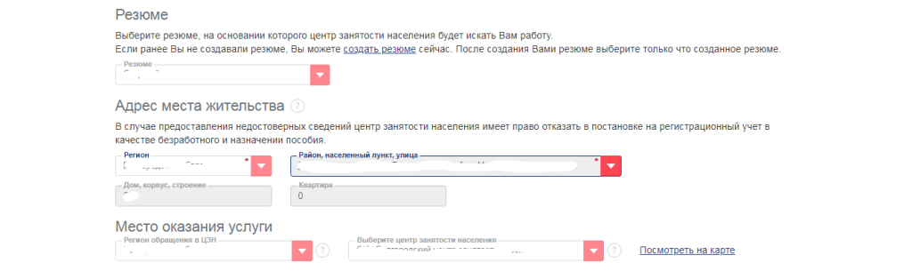 8. В форме заявления, заполняем все пункты которые автоматически не заполнены сразу, а так же выбираем созданное до этого резюме, указываем телефон, электронный адрес (обязательно тот которым вы пользуетесь) и ставите галочку напротив того способа связи и телефона и электронной почта, банковские реквизиты, Ваше место жительства, так же выбираем отделение ЦЗН по вашему месту жительства.