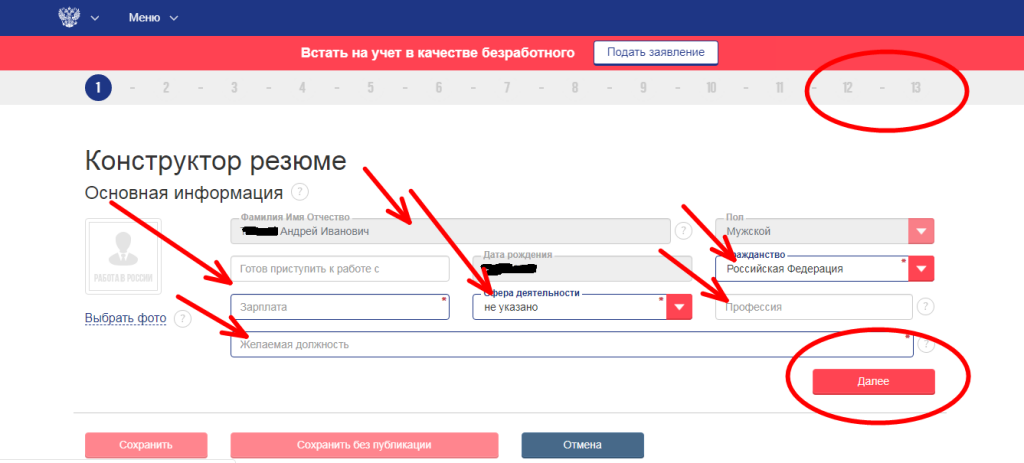 5. Попадем в конструктор Резюме, заполняем поля, если они не заполнены, своей информацией и нажимаем Далее, там будет 13 страниц где необходимо указать информацию для Вашего резюме.