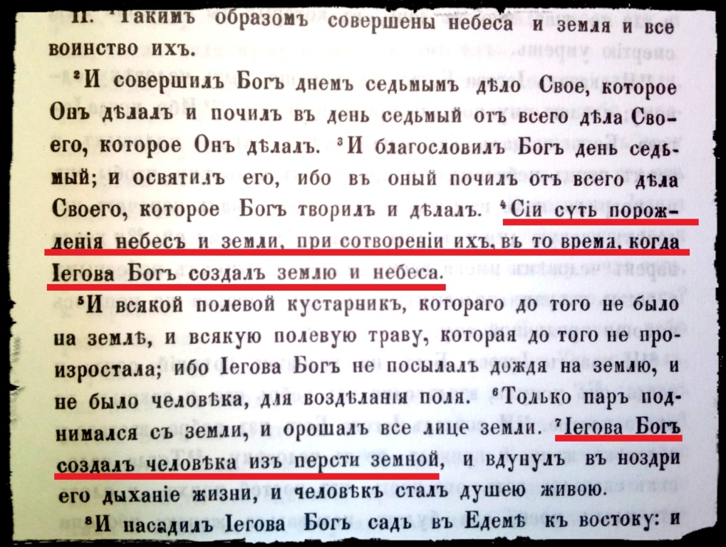 "Иегова Бог создал человека из персти земной, и вдунул в ноздри его дыхание жизни, и человек стал душею живою.