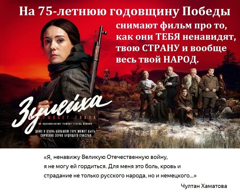 Славное имя Чулпан "всплыло" в связи с выходом на канале «Россия — 1» накануне 75-летия со дня Победы СССР в Великой Отечественной Войне сериала «Зулейха открывает глаза». Выход этого "одноразового" киноизделия, известного назначения, произвёл эффект "разорвавшейся бомбы" с фекалиями. Тупоголовые телепрокатчики "подарили" россиянам к Дню Победы "ушат помоев" про концлагеря, каторгу, репрессии, раскулачивание и "кровавый режим". С Чулпан Хаматовой в главной роли...