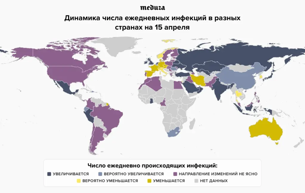 Вот так выглядит одна из наиболее подробных реконструкций того, что на самом деле сейчас происходит в мире. Она сделана группой Адама Кучарского из Лондонской школы гигиены и тропической медицины. На карте показаны страны, где прямо сейчас число новых инфекций идет на спад, и страны, где эпидемия еще набирает обороты. По многим из них данных слишком мало для надежной реконструкции, по другим (как, например, в случае США и Бразилии) данных достаточно, но принимаемые меры приблизили ситуацию к переломному значению, поэтому нельзя сказать однозначно, растет ли сейчас число инфицированных или все-таки падает — речь идет о стагнации.