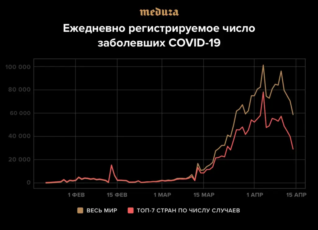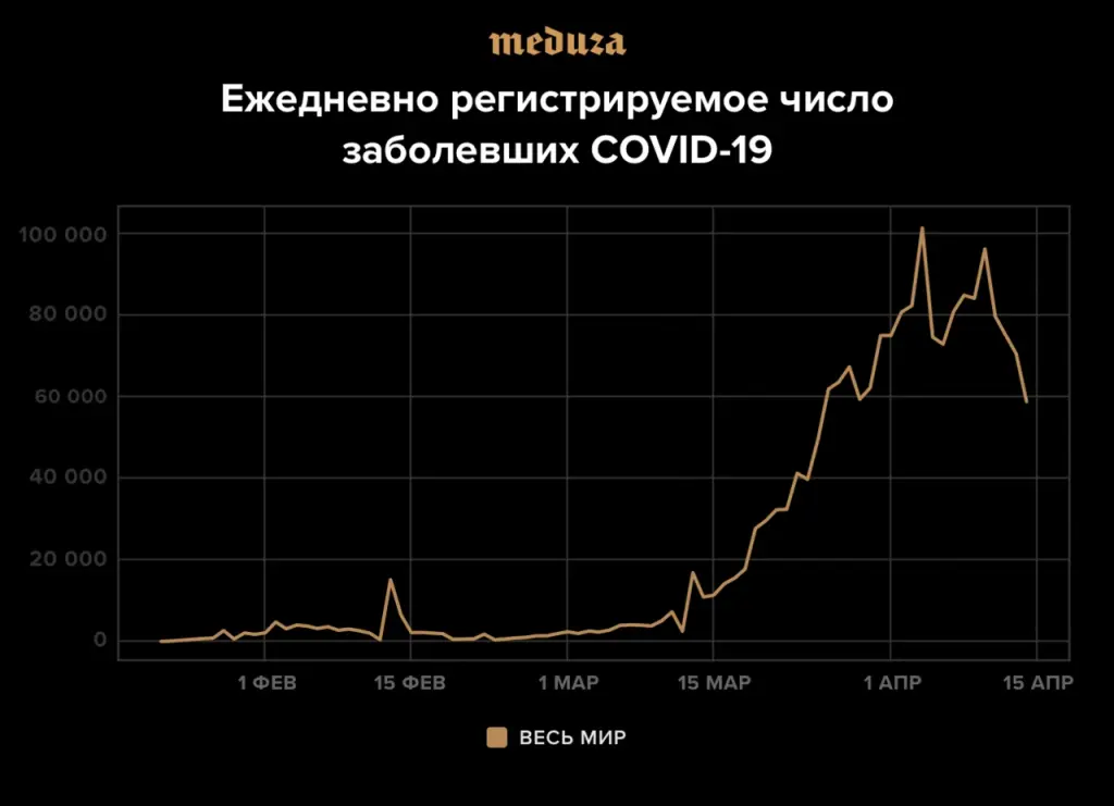 На графиках, где отражается ежедневное число регистрируемых случаев заражения коронавирусом, кажется, можно разглядеть что-то хорошее: значения пошли на убыль и пик эпидемии вроде бы уже позади. В то же время ВОЗ продолжает настаивать, что пик заболеваемости COVID-19 по-прежнему еще не пройден. Как так получается и кому верить? «Все материалы «Медузы» о коронавирусе открыты для распространения по лицензии Creative Commons CC BY. Вы можете их перепечатать! На фотографии лицензия не распространяется.