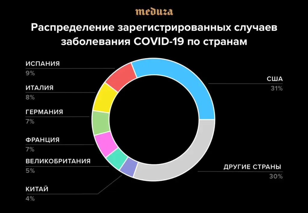 Из диаграммы ниже становится понятно, что половина всех зарегистрированных случаев заболевания приходится всего на три страны: США, Италию и Испанию. Если добавить к ним Германию, Францию, Великобританию и Китай, то совокупно эти семь стран покроют две трети всех зарегистрированных на данный момент случаев инфекции. Конечно, из-за нехватки тестов не все попадают в статистику. Но ощущение, что «пик уже прошел», формируют именно официальные данные.