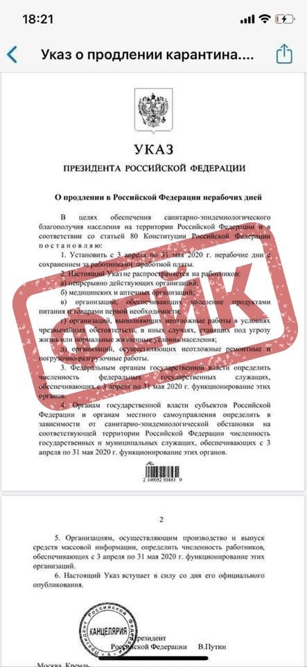 В Кремле наличие указа не подтвердили, заверив, что все документы незамедлительно публикуются на официальном портале. Из чего был сделан вывод, что документ является фейковым. Его рассылка может грозить россиянам уголовной ответственностью.