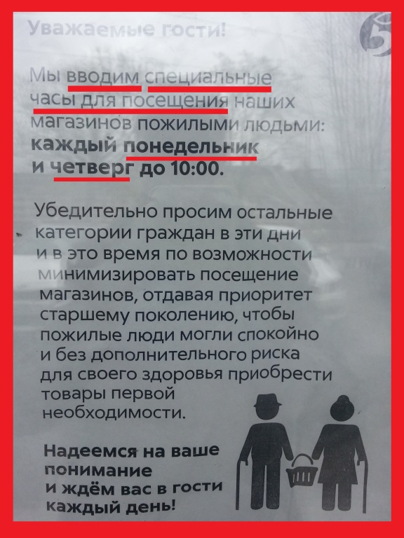 У нас на пятёрочке тоже такое об"явление висит. Я стараюсь ходить в магазин до 11 часов. Никакого скопления не наблюдаю. И никакой крамолы в подобных об" явлениях не вижу.