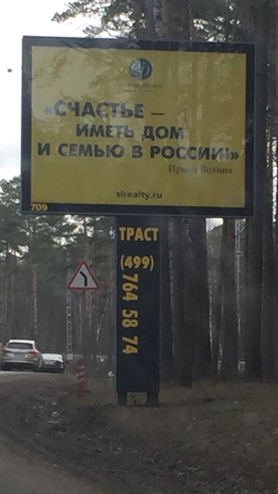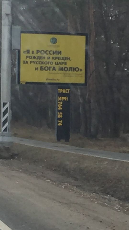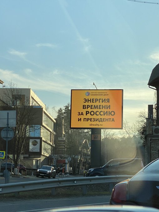 Жители Москвы и Подмосковья обратили внимание на баннеры с лозунгами «БОЖЕ, храни РОССИЮ и президента!», «РУССКИЕ ИДУТ — прощай Голливуд!», «Наступило ВРЕМЯ РОССИИ как самого БЕЗОПАСНОГО МЕСТА на Земле» и другими пафосными цитатами. Щиты с этими надписями можно увидеть на Рублево-Успенском, Новорижском, Ильинском, Минском, Калужском, Каширском, Ярославском и Ленинградском шоссе. Всего установлено около 200 баннеров.