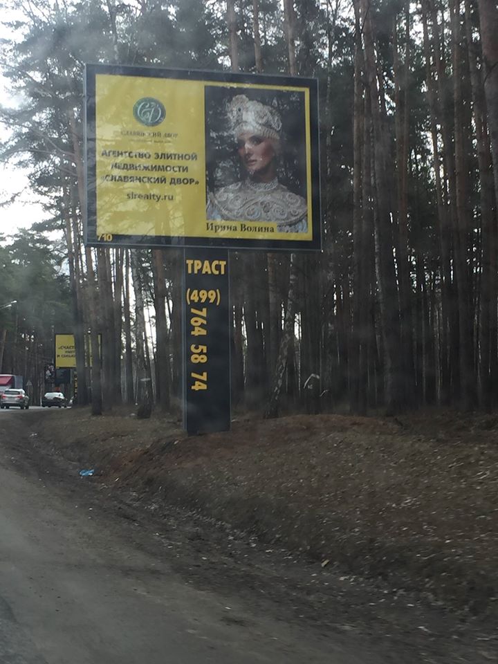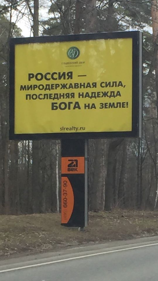 Галерист Айдан Салахова опубликовала у себя в фейсбуке фотографии необычных рекламных баннеров, размещенных вдоль Рублево-Успенского шоссе в Москве. На баннерах, оформленных в одном стиле, напечатаны непонятные «патриотические» цитаты: «Россия — миродержавная сила, последняя надежда Бога на Земле», «Красота — меч веры в руках мудрого», «Ищущий мудрости шествует на Восток, любящий суету бежит на Запад!»