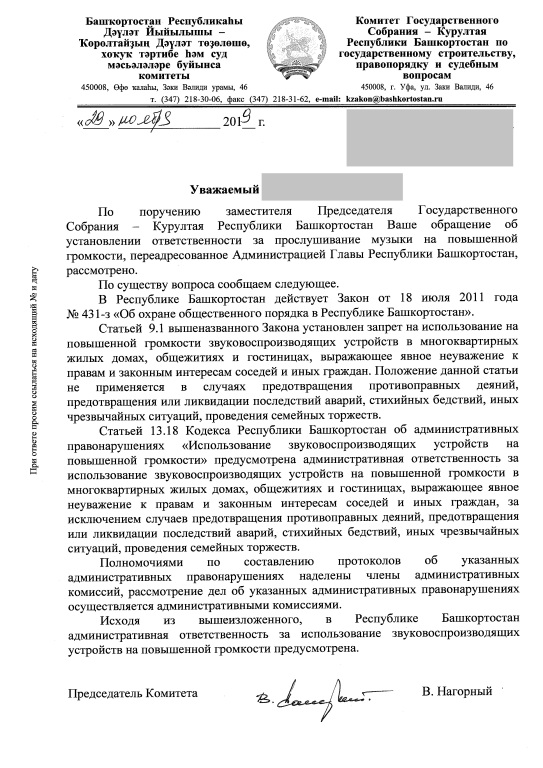Проблемы с "глухими" соседями, громко слушающих музыку за стенкой, думаю есть у половины граждан нашей страны. Это присланный ответ из Курултая на моё обращение. До момента получения этого ответа я обращался и в отдел полиции, и к участковому, и к инспектору общественной безопасности (в устной форме). Хотел узнать у них, что можно сделать с постоянным "бум-бумом" за стенкой. И конечно же я получил ответы такие же как и от моего "глухого" соседа: "до 23-00 любой имеет право шуметь как хочет".