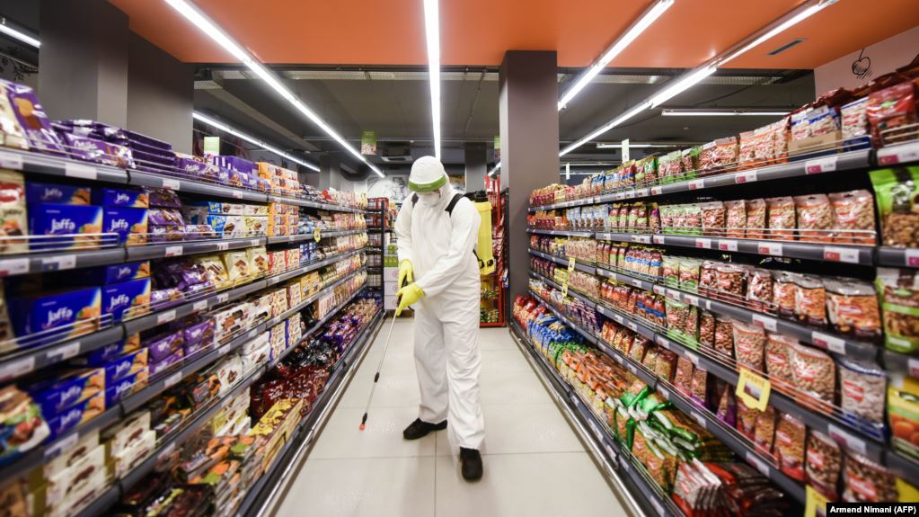 Дезинфекция полов в супермаркете в Приштине, столице Косова, 17 апреля 2020