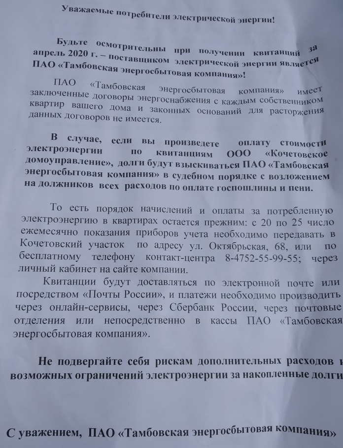 К сожалению, объявление от УКашки запечатлеть не успел, сегодня Тамбовская энергосбытовая его заклеила своим.