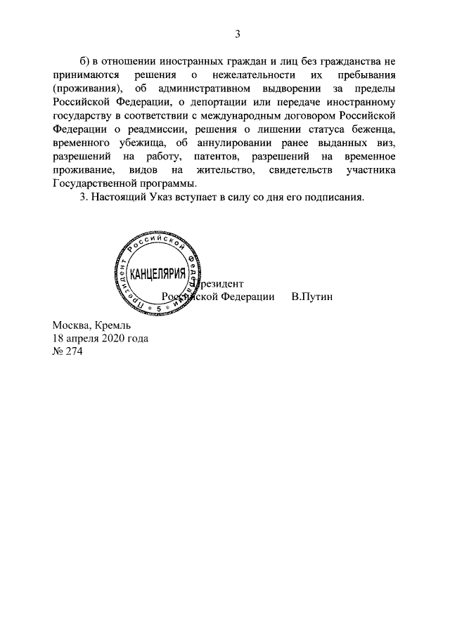 Документ называется «О временных мерах по урегулированию правового положения иностранных граждан и лиц без гражданства в Российской Федерации в связи с угрозой дальнейшего распространения новой коронавирусной инфекции (COVID-19)» и опубликован на официальном интернет-портале правовой информации в субботу утром. В силу он вступил с дня подписания, то есть с 18 апреля.