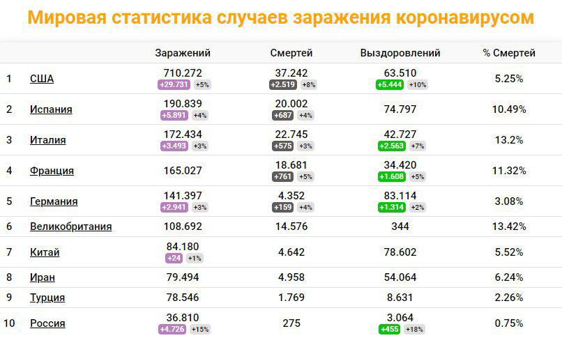 По состоянию на 18.04.2020 в России официально подтверждено 36 793 случая заражения коронавирусной инфекции 2019-nCoV (прирост за последние сутки – рекордные 4 785), 313 летальных случаев (прирост за последние сутки – также рекордные 40 смертей).
