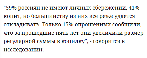 Если экстраполировать данную ситуацию на всю страну, то последствия будут просто катастрофическими и для экономики, и для граждан, большая часть из которых не имеете никаких накоплений, что подтверждается совместным исследованием, проведенным банком "Открытие" и страховой компании «Росгосстрах Жизнь» еще в сравнительно благополучном сентябре 2019 года.