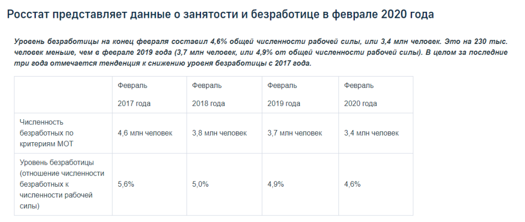 Даже непосредственно перед началом эпидемиологических мероприятий по закрытию экономики, по данным Росстата в стране насчитывалось 3,4 млн. человек, что составляет 4,6 % от рабочей силы.