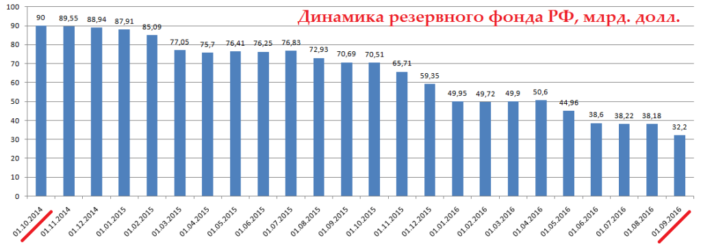 Объём резервного фонда начал резко падать после 2015 года и упал с максимального-свыше 5 триллионов рублей, до менее чем 1 триллиона. А потом вообще был упразднен и соединен с так называемым Национальным фондом благосостояния, который по сути и представляет сейчас резервный фонд РФ. Если рассмотреть динамику нашей экономики, связанную с агрессивной внешней политикой на примере войны на Украине и Сирии, а также связанных с этим санкций, то становится понятно куда делись деньги.