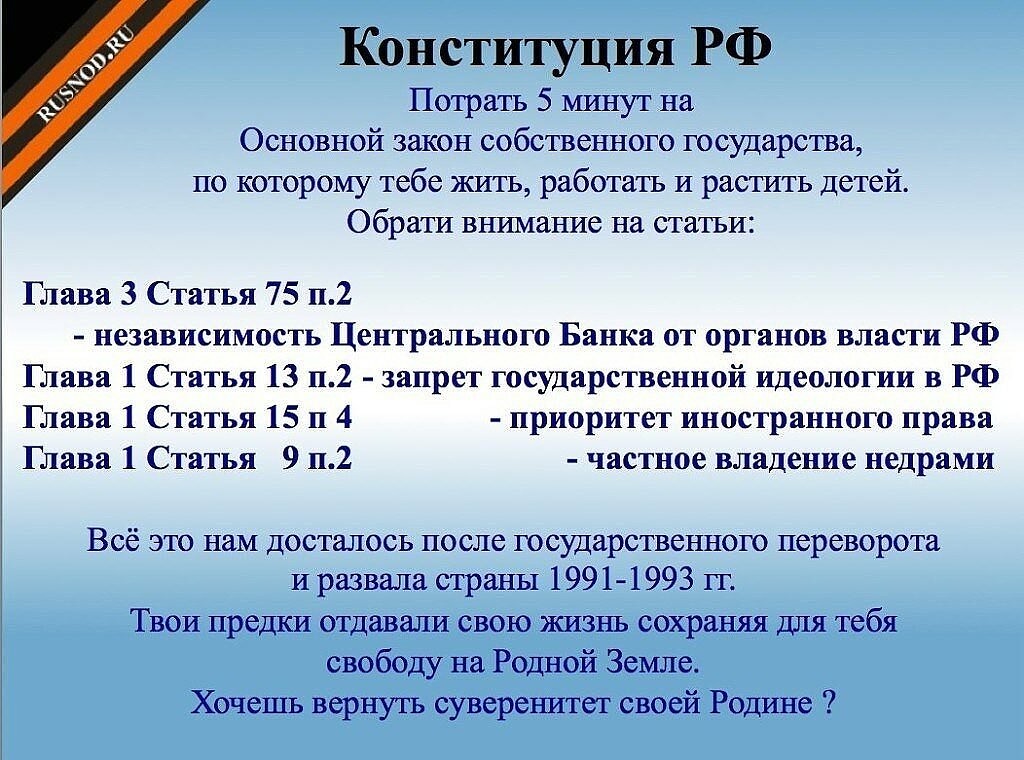Меня можете не слушать вообще, советую посмотреть таких компетентных людей как Катасонов, Богдасарян, Глазьев, Руцкого в конце-концов! Руцкой вообще красавчик! Он все изложил в своих доказательствах о незаконном развале СССР! Советую его посмотреть, чтобы было понятно как переписал Ельцин Конституцию РФ! Там все разжевано, видео доказательства! Так вот люди (человеки) советую прежде кричать гадости о нашем национальном лидере, нужно подумать, а сами ли вы пришли к такому выводу или вам кто то навязал! Это Путин закончил войну в Чечне (не он развязывал)! Путин воспитал лично во мне патриотизм и любовь к Родине! Что Ельцин или Горбатый участвовал хоть раз в бессмертных полках с фото героями ВОВ? Это Путин в 90 е травил молодежь паленым Алкоголем не совершеннолетних аааа? А можеть Путин участвовал в 90 х в ГКЧП? Подумайте хорошо-за кого вы? Американский однопалярный мир никто не отменял! ЭТО И ЕСТЬ БОЛЬШАЯ ИНФОРМАЦИОННАЯ ВОЙНА! yandex.ru
