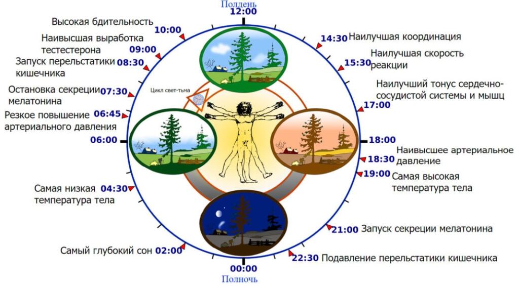 Циркадные ритмы Дело в том, что в нашем организме происходят различные процессы в зависимости от времени суток. Чтобы хорошо себя чувствовать, человек должен бодрствовать днем и спать ночью. Это и есть циркадные ритмы. Многие совершают серьезную ошибку, постоянно засыпая и просыпаясь в разное время, уделяя отдыху недостаточное количество часов.