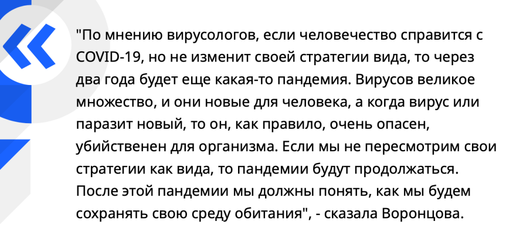 Нам всем очень важно понимать, что стратегия выживания человека на земле как вида в наше время приводит к разрушению окружающей среды, и именно поэтому необходима смена данной стратегии выживания, чтобы сохранить нашу планету и вычеркнуть из её истории разнообразные пандемии. Данное мнение высказывает биолог, Мария Воронцова, которая была участником конференций Конвенций ООН в области охраны животных и биоразнообразия.
