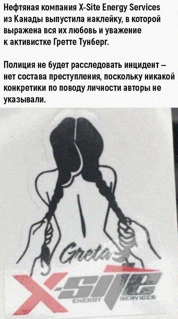 Пользователи Сети говорят, что девушка на рисунке напоминает 17-летнюю активистку Грету Тунберг. Ниже указано название нефтяной компании X-Site Energy Services, которую и обвинили в создании карикатуры.