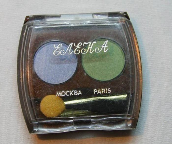 Советские тени – это продукты фабрики «Рассвет». Наборы «Елена» включали в себя два оттенка или три. Иногда можно было встретить палетки с большим количеством тонов, но все яркие, перламутровые (розовый, голубой, зеленый фиолетовый). Со временем, все же появились коричневые тона и серые.