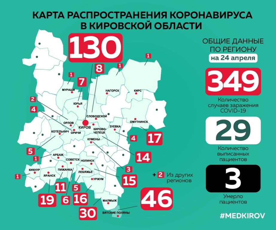 Общее число случаев заражения новой коронавирусной инфекцией в Кировской области составляет 349 человек, из них 31 случай выявлен за последние сутки. По данным областного минздрава, большинство пациентов с подтвержденным диагнозом «коронавирус» находятся в удовлетворительном состоянии. Все они получают лечение в полном объеме в условиях инфекционных госпиталей города Кирова.