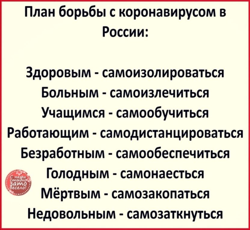 Медицинские "авторитеты"заявляют и о продлении режима до осени, наш губер об'явил уже самоизоляцию на весь май, а Собянин сегодня сказал, что еще далеко до пика инфекции. А нас кто кормить станет? Если выперли с работы, предприятия закрылись?