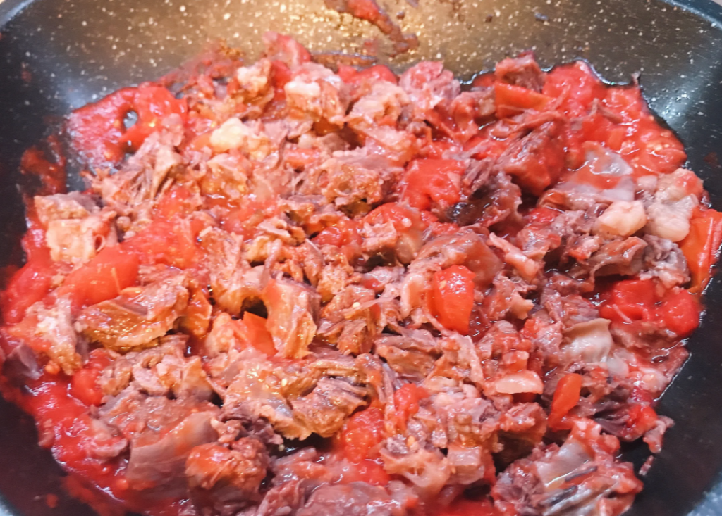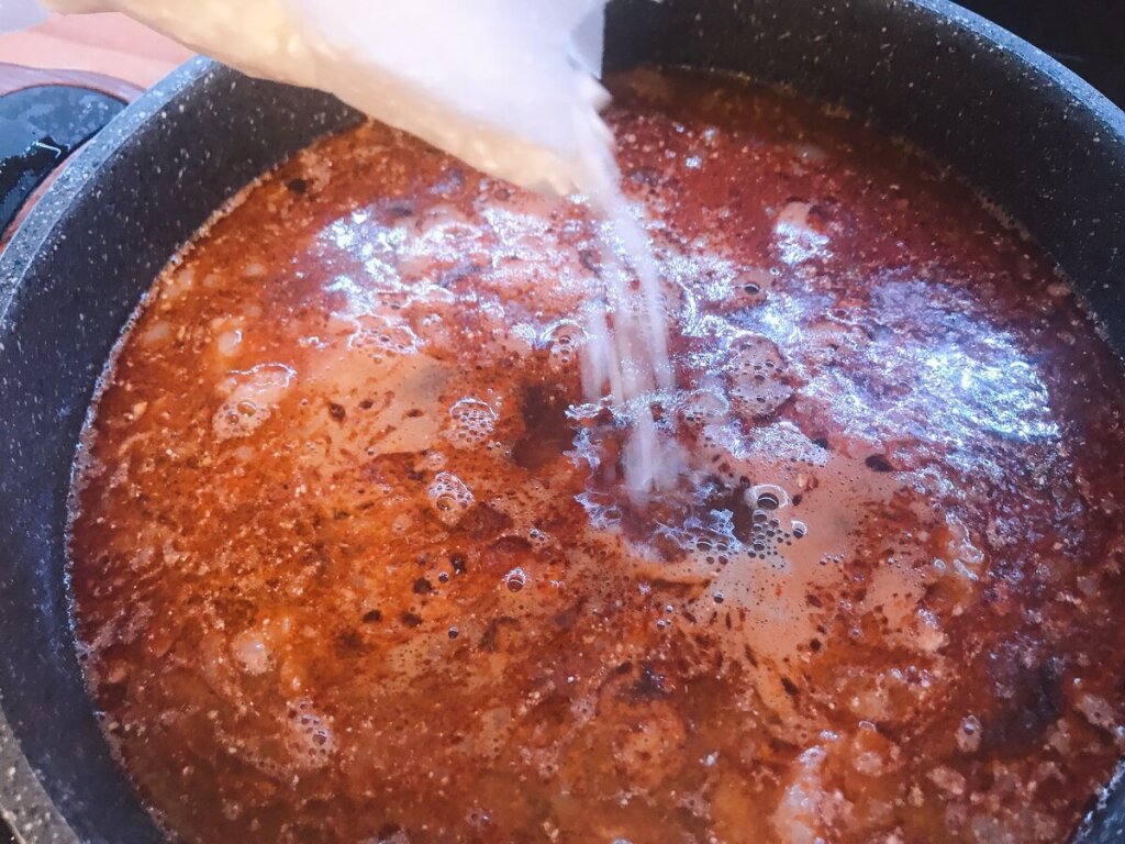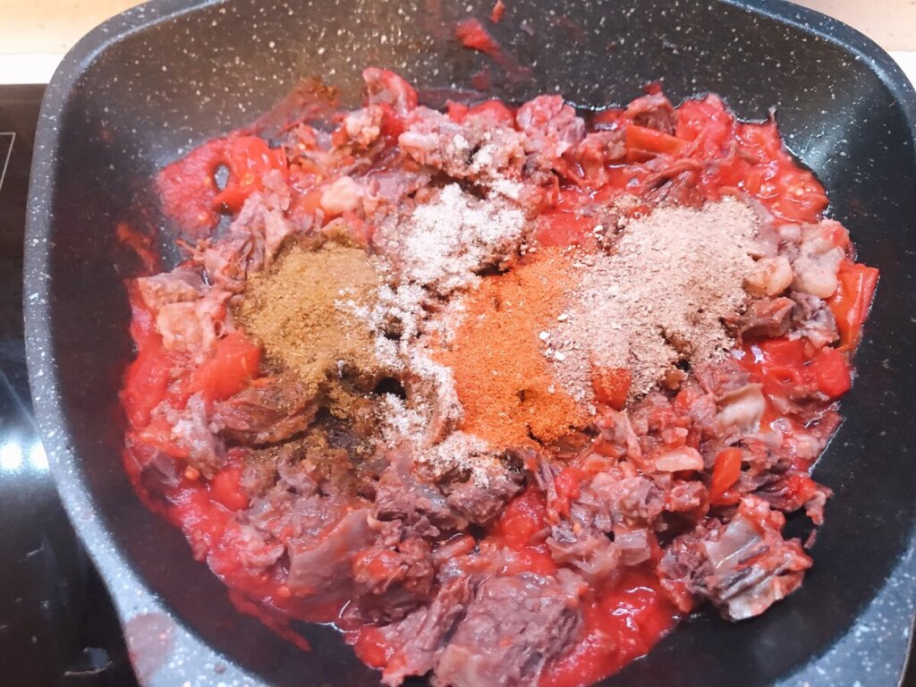 Пену надо снять полностью. Затем, в суп добавляем одну среднюю нечищеную морковь, порезанную пополам и половину нечищеной луковицы и томим 1-1.5 часа. Тем временем возьмем 200 грамм чищенного томата, порежем его на кусочки и обжарим его на подсолнечном масле на среднем огне минут 5.Достаем из бульона ребра, снимаем мясо с костей, режем его на кусочки и отправляем к зажарке. Добавляем 1 чайную ложку красного перца, 1 чайную ложку хмели-сунели, 1 чайную ложку уцхо-сунели, половину чайной ложки шафрана и половину чайной ложки кориандра молотого.