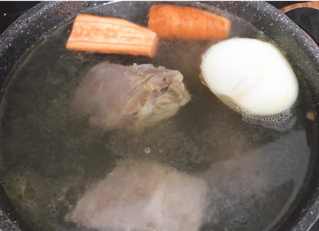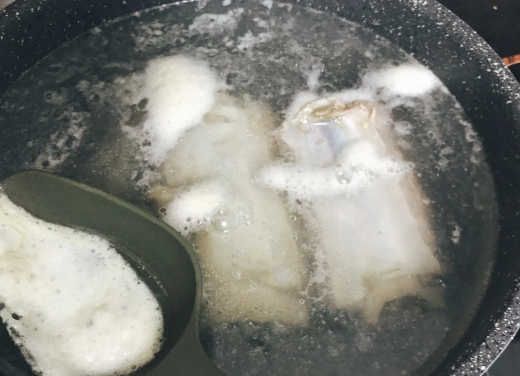 Залить их снова холодной водой 3.5 литра и вновь довести до кипения. Когда вода начала закипать, снимите пену, и поставьте на средний огонь.