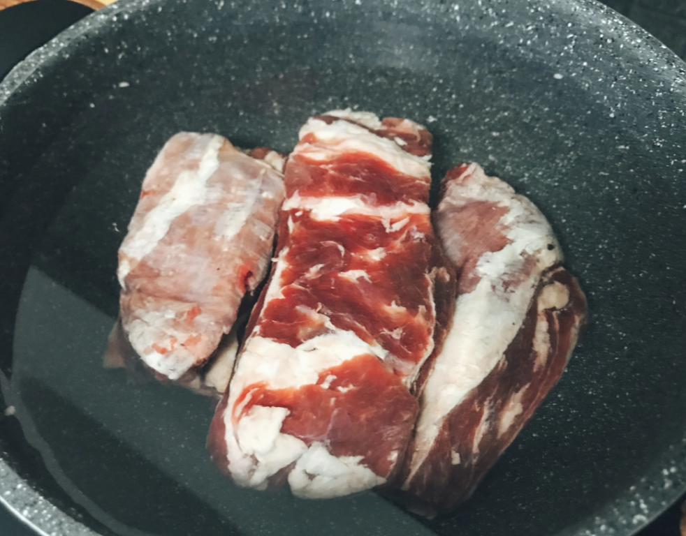 До этого готовил аналог, а так же делал харчо, но этот суп понравился больше, так как ингредиентов меньше, взял на заметку рецепт и теперь будем готовить только так. В холодную воду нужно положить 400 грамм говяжьих ребер и довести до кипения. Проварить минут 10-15, воду слить, кастрюлю промыть и ребра тоже.