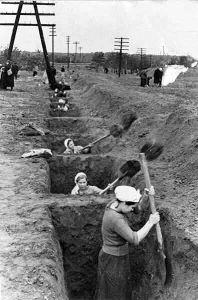 На подступах к городу десятки тысяч москвичей рыли окопы и противотанковые рвы. Тут больше всего было женщин, пожалуй всех возрастов.