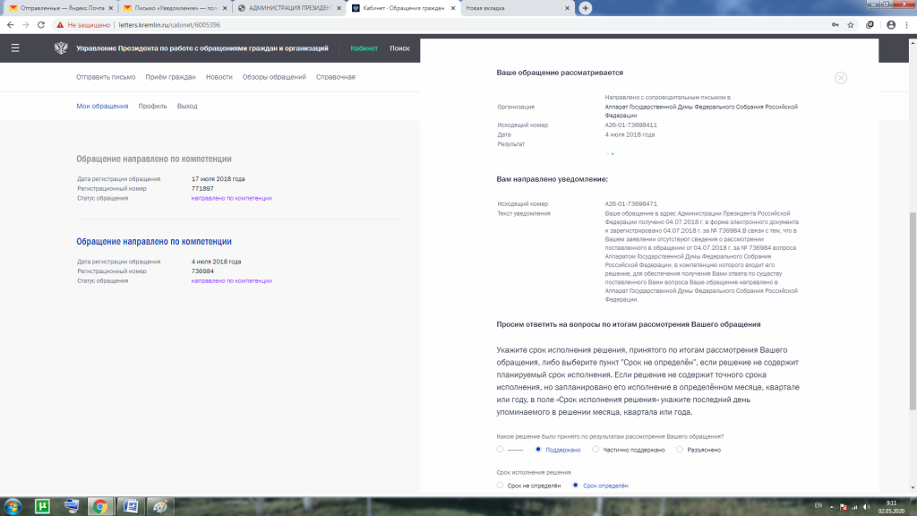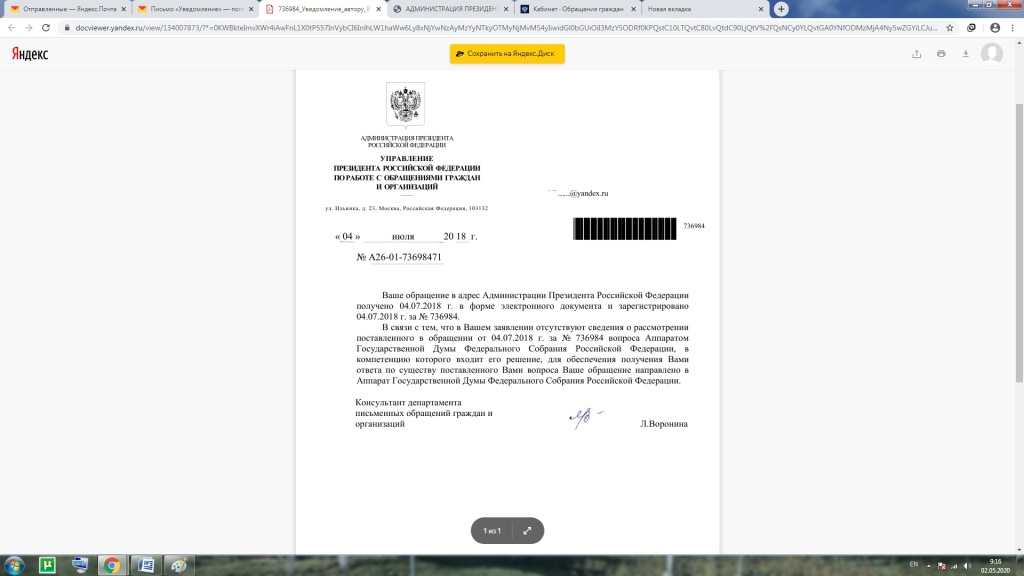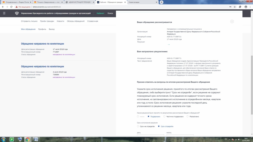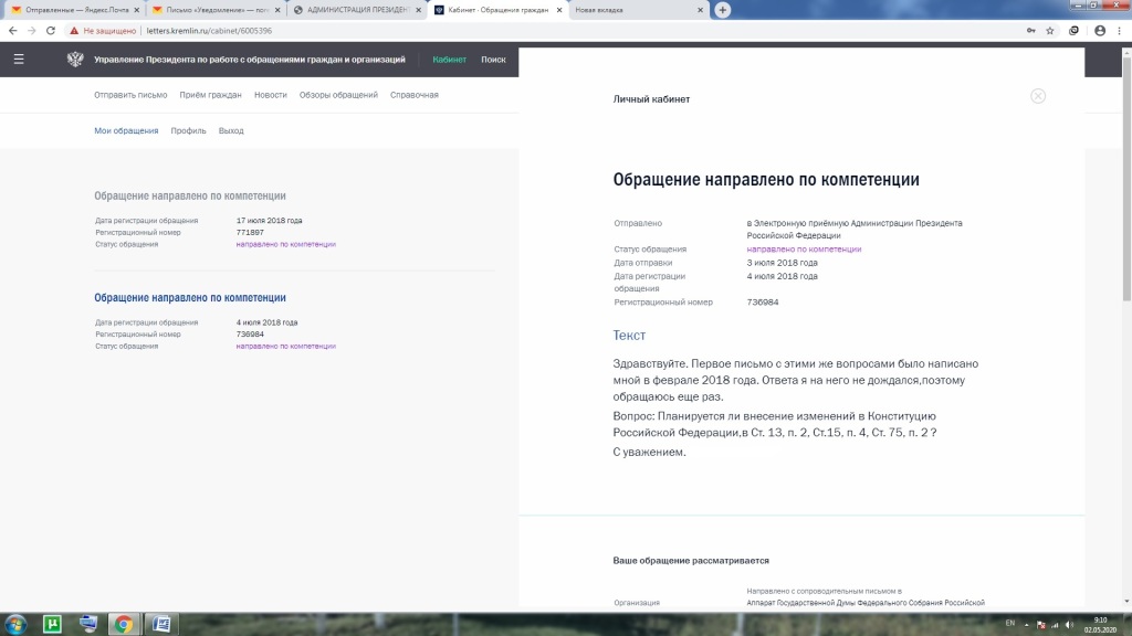 Уважаемый Вячеслав, специально для вас фотоотчет по моим обращениям в администрацию Президента РФ. Надеюсь, Вы удовлетворены. При Вашем желании могу прислать отчеты по обращениям в нижестоящие органы, а также переписку с участником этого форума, юристом, которому я задавал вопросы относительно поправок в Конституцию.