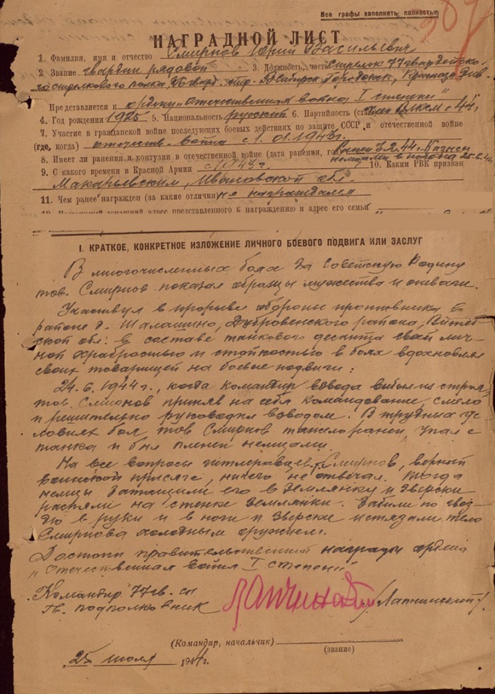 Справка: В 1944 году бойцу Юрию Смирнову присвоили звание Героя Советского Союза. Посмертно.