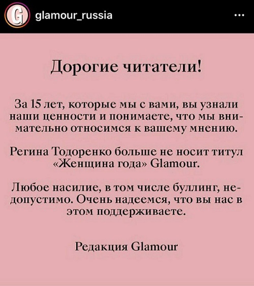 Для начала журнал Glamour, который присудил Тодоренко в 2019 году звание «Женщина года», аннулировал это награждение, объяснив что высказывания Регины идут в разрез с политикой журнала.