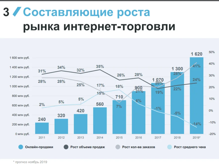 Согласно данным Data Insight, интернет-торговля растет только за счет числа заказов. Средний чек при этом падает с 2015 г. Это значит, что покупатели предпочитают приобретать недорогие товары, но в большем количестве.