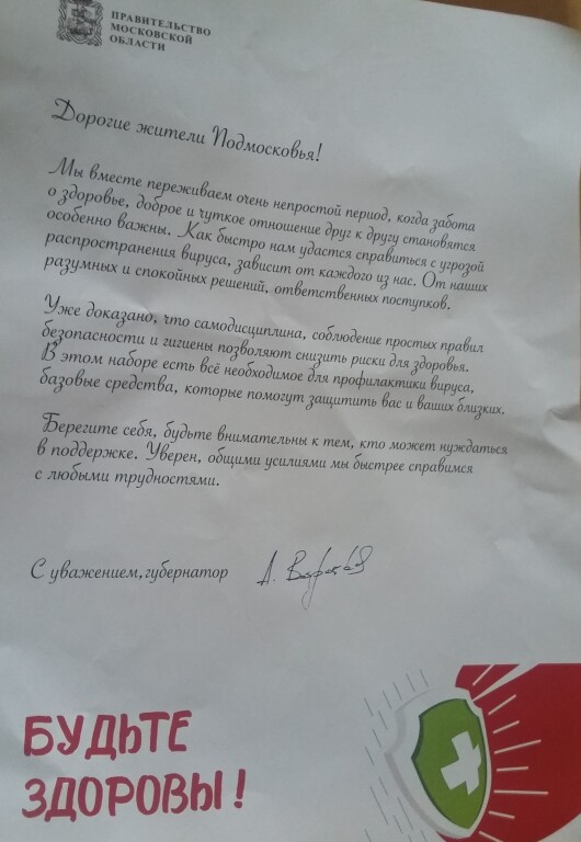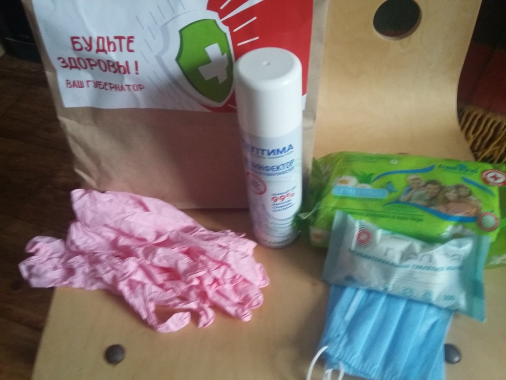 Вчера днем мне опять позвонили из администрации города и сообщили, что еще положено мне получить медицинскую профилактическую помощь. Сегодня, буквально полчаса назад, мне доставили медицинский набор от губернатора и письмо. Две дамы средних лет в масках привезли мне пакет.