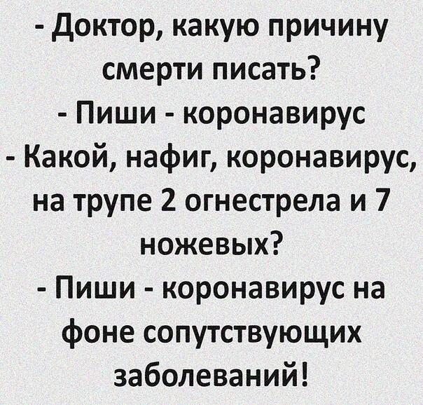 Именитые германские врачи провели уже сотни вскрытий умерших с (+)тестом на "корону" и не нашли ничего, кроме букета хронических тяжелых заболеваний.