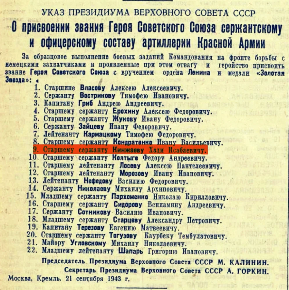 Указом Президиума Верховного Совета СССР от 21 сентября 1943 года за «мужество и героизм, проявленные в боях с немецкими захватчиками» старший сержант Ходи Кинжаев был удостоен высокого звания Героя Советского Союза с вручением ордена Ленина и медали «Золотая Звезда» за номером 2214.