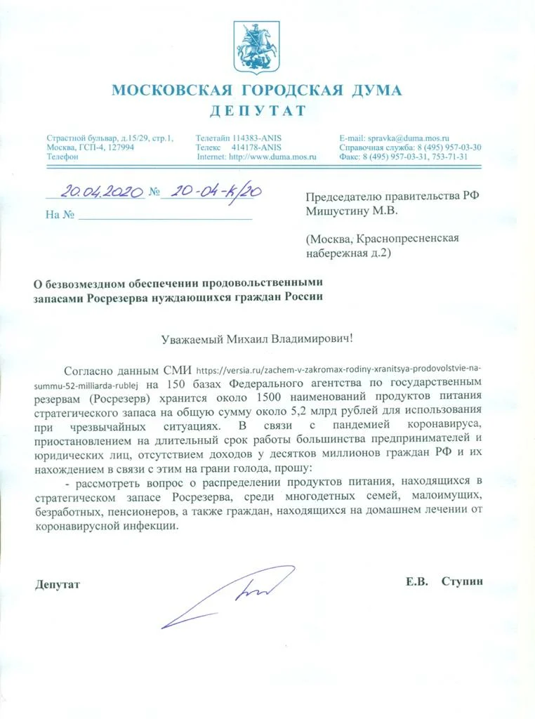 20.04.2020 депутат Евгений Ступин сделал обращение председателю правительства РФ Мишустину М.В.