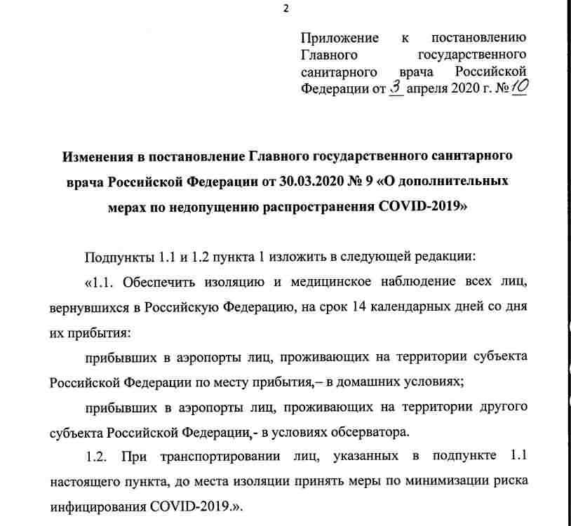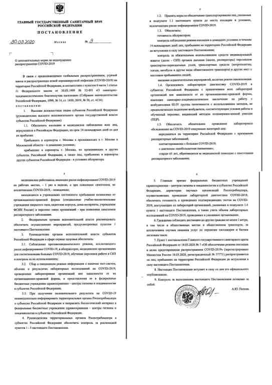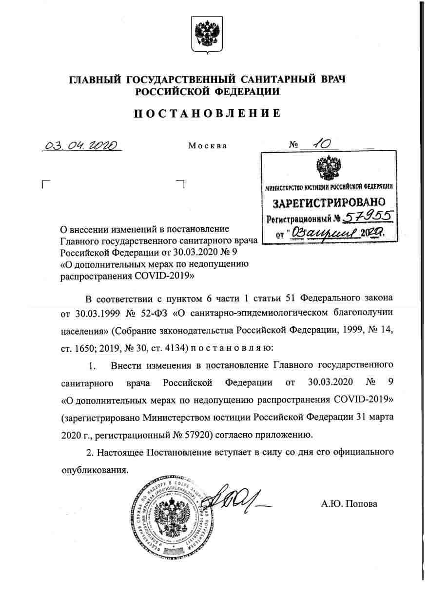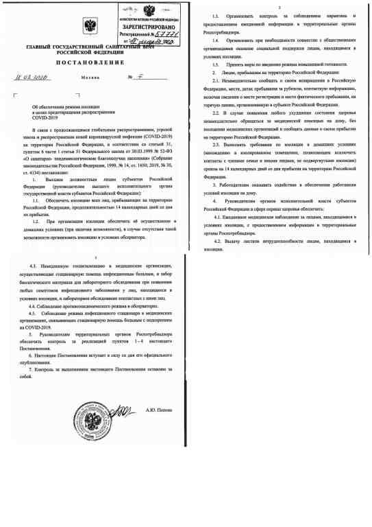 Все распоряжения гл. сан. врача "РФ" Поповой касаются должностных лиц и лиц прибывших из-за рубежа и находящихся на карантине. К остальным гражданам все решения носят рекомендательный характер. Просто на местах чиновники перегибают палку и перестраховываются за счёт данных им Путиным полномочий. Нет распоряжения гл. сан. врача "РФ" о каких либо "карантинах", ЧС или ПЧ. Сами почитайте. Обратите внимание - Печать гербовая (ГОСТ Р 51511), есть живая подпись, зарегистрировано.
