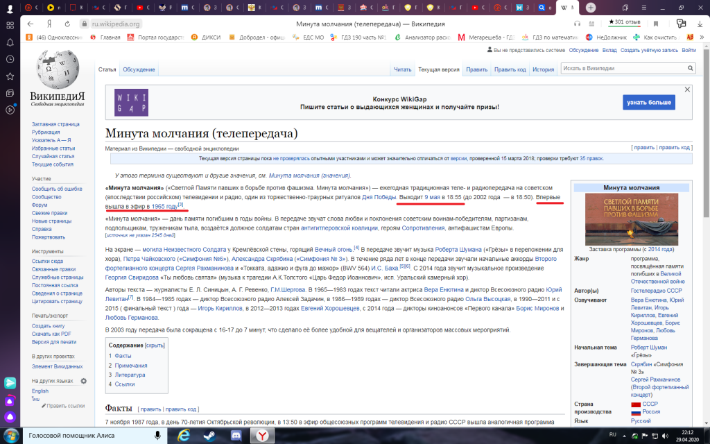 Нет. С 1965 года Минута Молчания ровно в 19:00. Передача раньше начиналась в 18:50, сейчас вроде в 18:55, ну а сама Минута Молчания ровно в 19:00. Включите любой центральный канал в 18:45 и ждите. Сами посмотрите и детей подготовьте - объясните, что это за передача.: Было раньше: