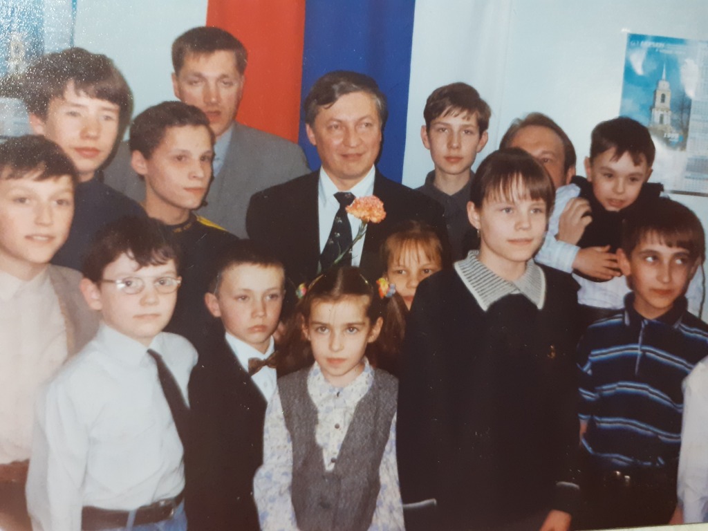 На фото: это мы с чемпионом мира Анатолием Карповым. Город Пермь. Шахматная школа. Вот там справа от чемпиона чубчик моего друга, тренера Вовы Истомина выглядывает.