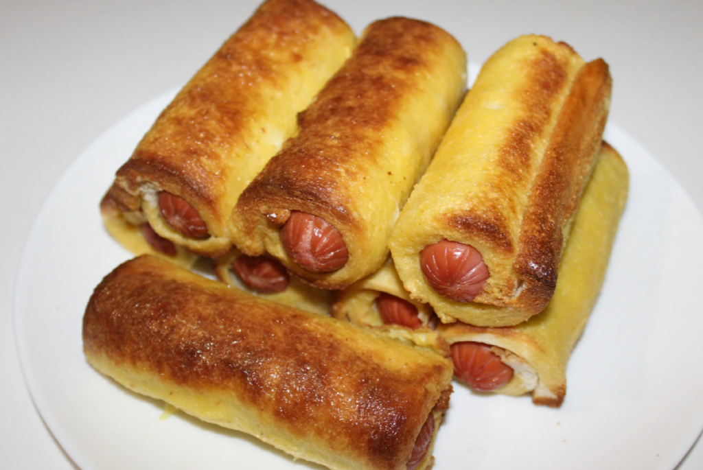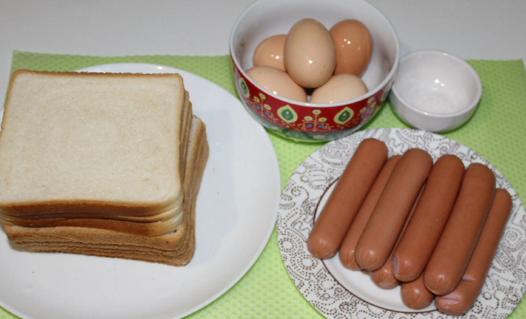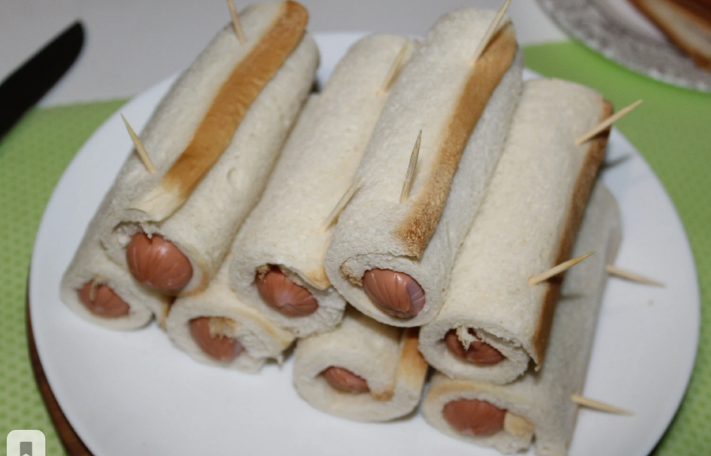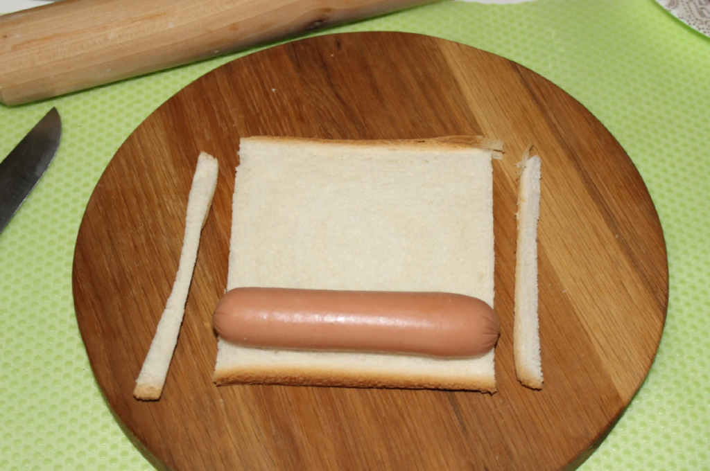 Кусочек хлеба слегка раскатать скалкой, при необходимости обрезать с краев, если сосиски коротковаты.