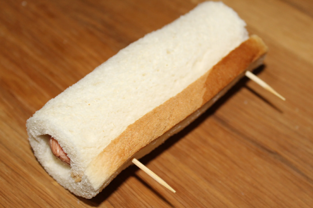 Закрутить сосиску в кусочек хлеба, скрепить зубочистками.