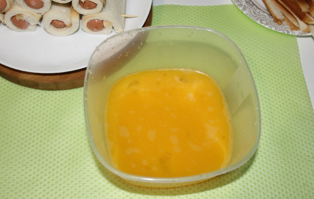 На 8 сосисок мне понадобилось 4 яйца. Обмакнуть каждую сосиску в яйца и выложить в смазанную форму для выпечки.