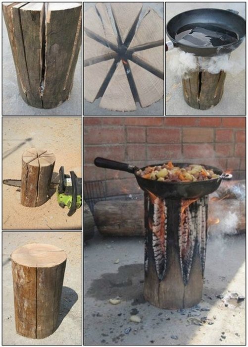 Костер под названием «шведская свеча» — это способ приготовить пищу на природе, если нет совсем ничего: ни мангала, ни гриля. Берется полено, распиливается, как тортик, на секции, только распил нужно делать не до конца, а оставлять примерно пятую часть внизу полена. После этого внутрь помещаются щепки, кора, солома или другой легко воспламеняющийся материал, и костер поджигают. Если обмотать полено проволокой, то можно поставить что-нибудь тяжелое.